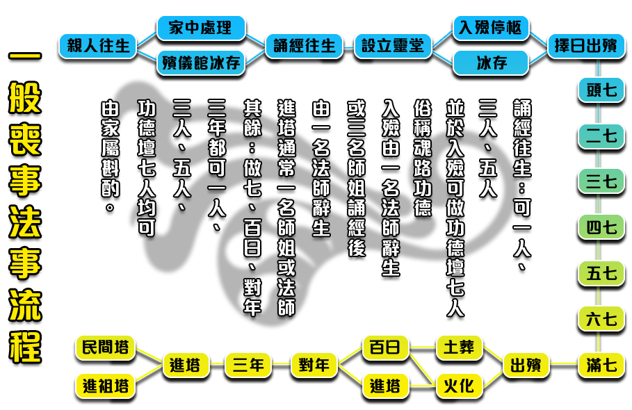 進塔:可分為三種,民間土葬塔、開門式祖塔、財團公司塔,各有不同,但需要亡者的生辰,家屬歲數和生肖,亦需塔位方向。