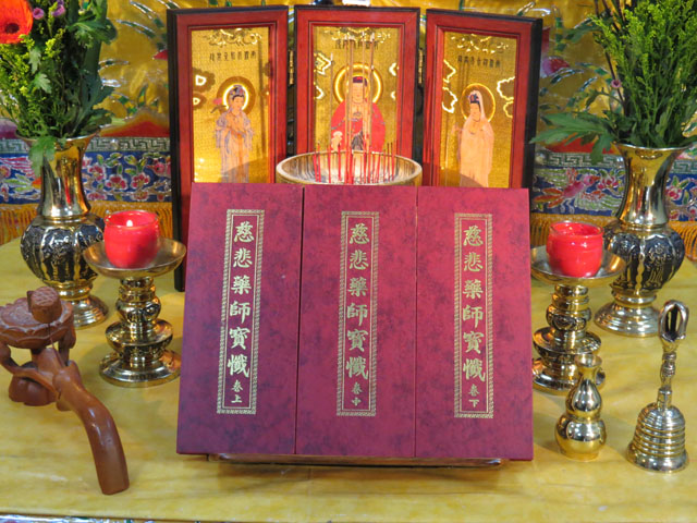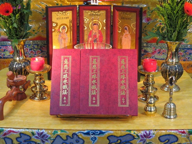 道士功德壇:一天小功德:分兩部份時間,一者前天擇良辰起鼓,發奏表文,請佛,引魂,沐浴,開宣經典(慈悲三昧水懺)巷三卷,二者視當天時間,繼宣水懺,完懺,獻敬,再宣三品妙經(金剛經,普門品,彌陀經)頂禮,開光解願,放赦,過橋,還庫(燒庫錢)送佛。