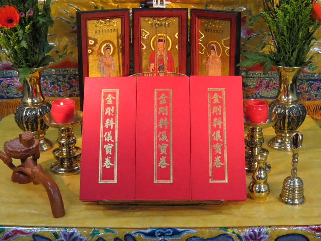 誦經功德壇: 一天:分兩部份時間,一者前天擇良辰起鼓,演淨請佛,引魂,開宣經典(慈悲三昧永懺)共三卷,或(銷釋金剛寶卷)合全卷,視時間誦經,並配合喪家時間做調整,二是當天視時間,繼宣經典,午獻,誦經圓滿,送佛,燒庫錢(金銀財寶)